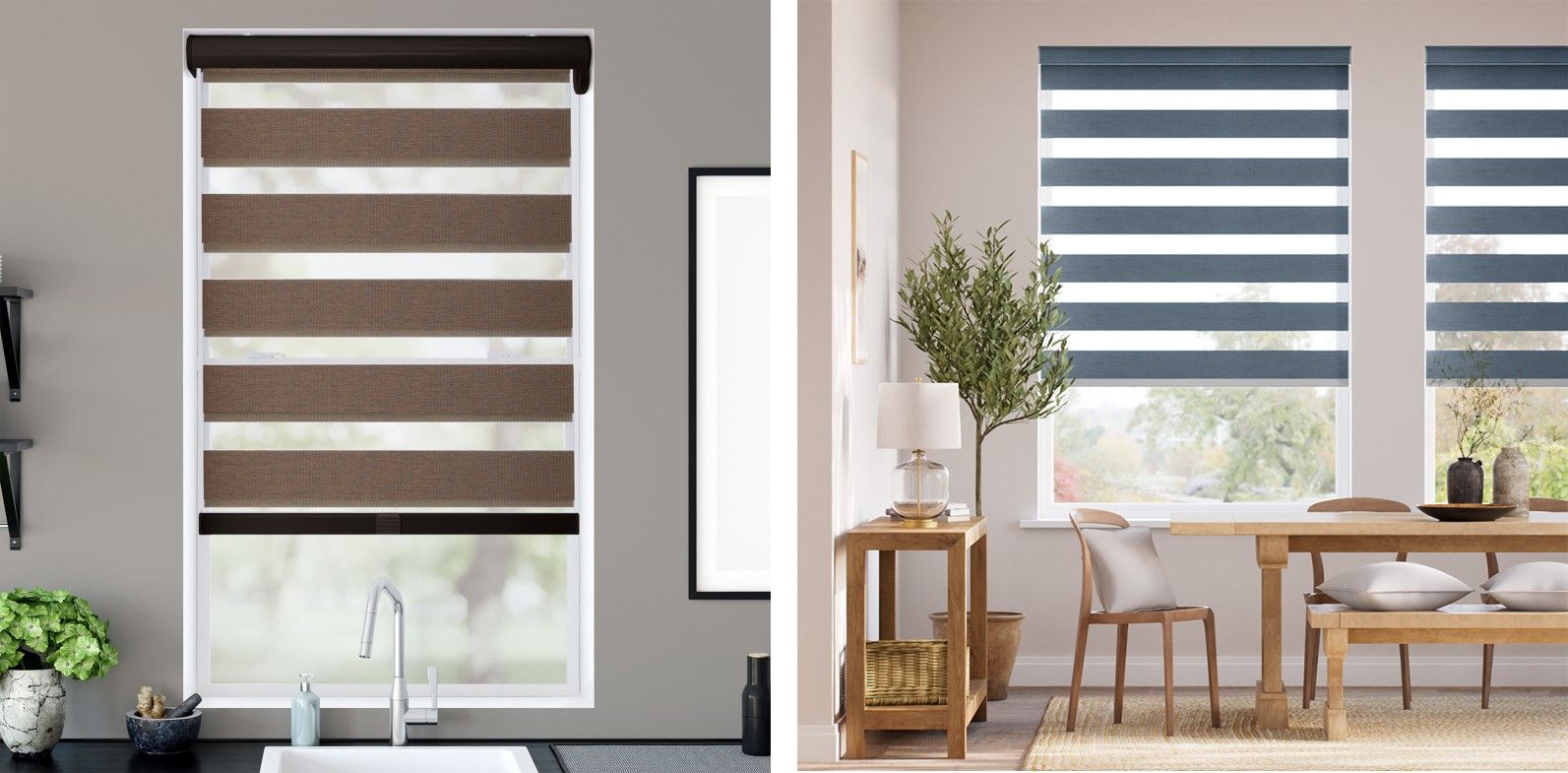 Zebra shades have alternating bands of opaque and sheer fabric that can be aligned for light filtering or complete privacy. They offer modern aesthetics with flexible light control.